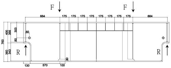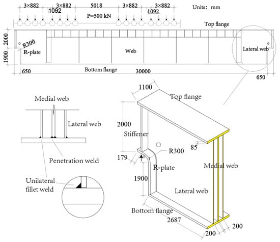 In this section, fatigue tests were performed with variable-section supports with R-plates and three-web plates. The section dimensions and the crane wheel loads in practical engineering applications are shown in Figure 5. To reduce the stress level in the variable section, two lateral webs were added in the variable-section support. The length and depth of the section were 30 m and 3.9 m, respectively. The cope depth and length from the support were 2.0 m and 0.65 m, respectively, and the cope radius was 0.3 m. The girders were made of steel with a yield strength of approximately 345 Mpa.
