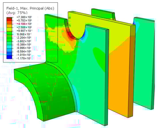 To facilitate loading, the prototype was first scaled to 1/5 to ensure geometric similarity. Secondly, appropriately adjusting the beam length, the position of the transverse stiffening rib and the loading position served to ensure sufficient stiffness of the test model and the similarity of the stress pattern between the R-plate and the web with the prototype. After a large amount of trial calculation, the test model with the size and loading position as shown in Figure 6 satisfied the similarity of the stress pattern with the prototype. The test model differed from the prototype In terms of maximum primary stress by 7.8 Mpa, approximately 3.5% of the maximum main stress of the prototype, as shown in Figure 7.