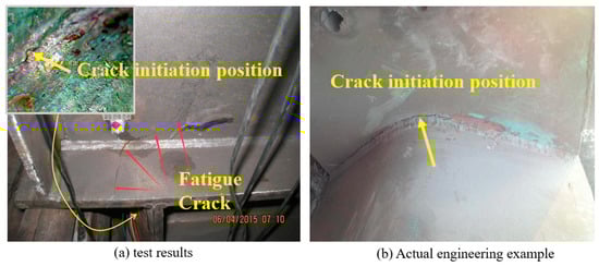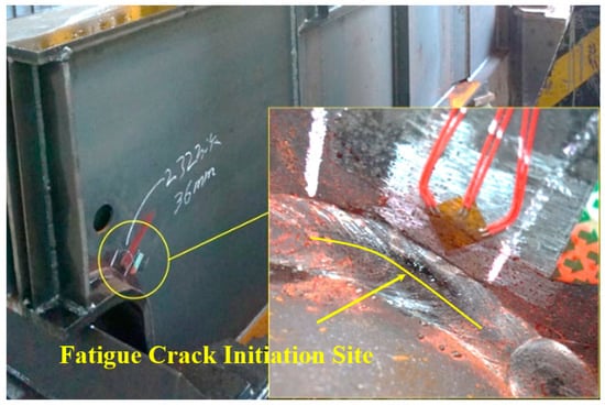 The test results in Figure 12 and Table 3 showed that the fatigue crack initiation sites in the variable-section supports with right-angle curved end plates were at the weld toe on the plug-in plate and were approximately 98.7 mm from the starting point. Thereafter, the crack simultaneously extended along the thickness direction and along both sides of the web plate. Once the cracks extended to the web above the plug-in plate, the crack propagation speed increased quickly. When the plug-in plate was completely fractured, the steel crane beam lost bearing capacity. The fatigue crack growth process was essentially the same in the eight specimens.