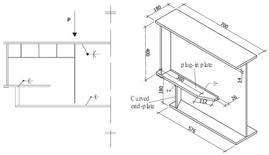In this section, fatigue tests were performed with variable-section supports with right-angle curved end plates. Similar to the fatigue tests in the previous section, the study created and tested eight scaled crane runway girders with right-angle curved end plates. Sample sizes were all 1:5 to actual prototypes. As shown in Figure 11, all specimens have two coped ends and a length of 2.1 m. The central portions of the prototypes were intentionally shortened for specimens. A 5.25 m coped end length in the prototype was equivalent to a 1.05 m coped end length for each specimen. Scale specimens were constructed from steel with a 345 MPa yield strength. The welds on the top flange plate, the bottom flange plate, and the web were penetration welds. The welds between the plug-in plates and the curved end plates were penetration welds. The other joint welds were all fillet welds. All weld heights were 0.5 times the thickness of the welded plate.