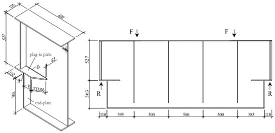 In this section, fatigue tests were performed with variable-section supports with right-angle end plates. Similar to the fatigue tests in the previous section, six scaled specimens of crane runway girders with right-angle end plates were fabricated and tested. All specimens were scaled to the actual prototypes using a 1:4 ratio. Each specimen had two coped ends and was 2.5 m long, as shown in Figure 13. The central portions of the prototypes were intentionally shortened for specimens. A 5.0 m coped end length in the prototype was equivalent to a 1.25 m coped end length for each specimen. Scale specimens were constructed from steel with a 345 MPa yield strength. The welds on the top flange plate, the bottom flange plate, and the web were penetration welds. The welds between the plug-in plate and the end plate were penetration welds. The other joint welds were all fillet welds. All weld heights were 0.5 times the thickness of the welded plate.