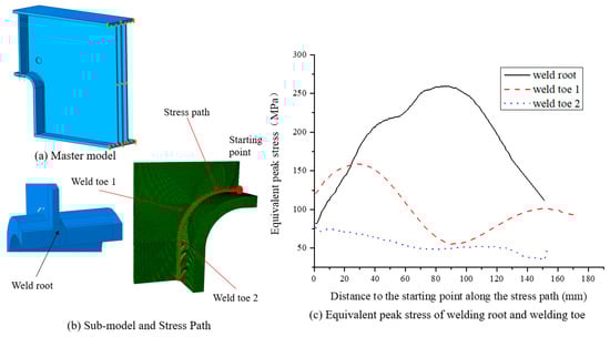 For the variable-section supports with R-plates and three-web plates, the applied vertical support reaction at the support was 250 kN. Surface contact, which transmits only compressive stresses, was set in the unwelded part of one side of the fillet weld between the lateral web and R-plate to simulate the gap at the root of the weld. The sub-model, the stress path of the weld toe and weld root, and the local cylindrical coordinate system are shown in Figure 15a. To facilitate the calculation of the equivalent peak stress, the normal vector of the element surface at the R-plate was oriented perpendicular to the direction vector of the stress path. The peak stress in the arc segment of the stress path was obtained by transforming the stress components in local cylindrical coordinates to local polar coordinates. The peak stress in the line segments of the stress path was obtained by transforming the stress components in a global cartesian coordinate system to local polar coordinates. The results are shown in Figure 15b.