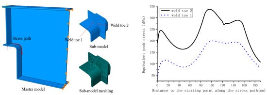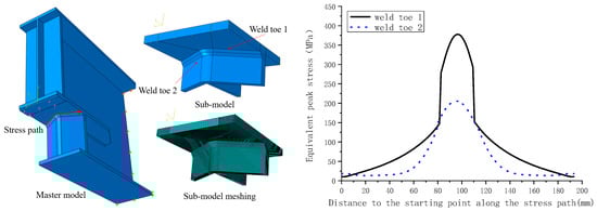 For the variable-section supports with right-angle curved end plates, the applied vertical support reaction at the support was 275 kN. Using the same method as that used for the other supports above, the equivalent peak stresses in the two weld toes of the weld between the curved end plate and the plug-in plate were calculated. The finite element analysis model, the stress path, and the calculation results are shown in Figure 17. The calculation results showed that there were large stress concentrations in the weld between the curved end plate and the plug-in plate. A comparison of the equivalent peak stresses in Weld Toe 1 and Weld Toe 2 showed that the stress concentrations in Weld Toe 1 were obviously greater than those in Weld Toe 2. The maximum equivalent peak stress of Weld Toe 1 was 378 MPa, located 100.0 mm from the starting point along the stress path. Therefore, the fatigue crack initiation sites in the variable-section supports with right-angle curved end plates were 100.0 mm from the starting point.