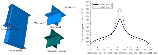 For the variable-section supports with R-plates, the applied vertical support reaction at the support was 245 kN. Using the same method as that described above, the equivalent peak stresses of the two weld toes of the weld between the web and the R-plate were calculated. The finite element analysis model, the stress path and the calculation results are shown in Figure 16. The calculation results showed that there were large stress concentrations in the weld between the web and R-plate. The variable-section supports with R-plates were subjected to Mode I + II loading conditions. A comparison of the equivalent peak stresses in Weld Toe 1 and Weld Toe 2 showed that the stress concentrations in Weld Toe 2 were obviously greater than those in Weld Toe 1. The maximum equivalent peak stress in Weld Toe 2 was 336 MPa, located 98.0 mm from the starting point along the stress path, i.e., the junction between the arc segment of the R-plate and the straight segment. Therefore, the fatigue crack initiation sites in the variable-section supports with R-plates were 98.0 mm from the starting point.