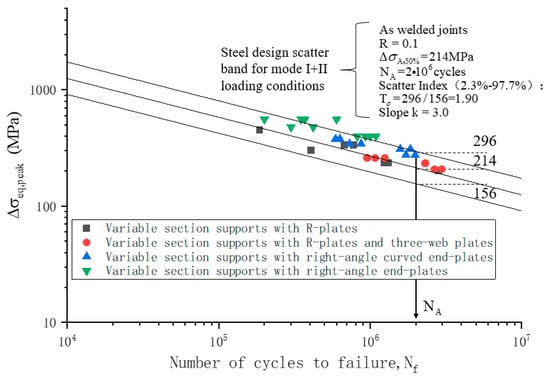 The design curves in Figure 4 and the experimental results were in good agreement as shown in Figure 19. Most of the test results were within the scatter band, which was unaffected by the geometry of the variable-section supports, and all test data were above the lower limit of the design curve. Therefore, using this curve for fatigue life evaluation for different variable-section supports will yield relatively reliable results.