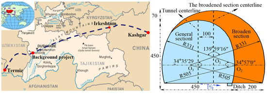 Turkmenistan is the starting point of the China–Tajikistan natural gas pipeline tunnel, which travels from west to east through Uzbekistan, Tajikistan and Kyrgyzstan before arriving in Kashgar, China. The tunnel’s overall length of the tunnel is 1860 m with a one-way slope of 10.48% uphill from the entrance to the exit, and its maximum buried depth is 260 m. To ensure the normal passage of transport vehicles, a widened section with a length of 15 m was built every 200 m. The width × height of the general section is 4.5 m × 4.5 m, and for the broadened section it is 6.5 m × 5.2 m. The tunnel was excavated from the general section to create the broadened section. According to the design data, the general location of the gas pipeline and a schematic diagram of the tunnels cross-section are depicted in Figure 1.