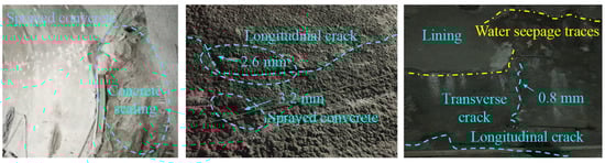 To ensure the normal passage of transport vehicles, a widened section was built every 200 m. During the construction, cracks appeared in the shotcrete and lining on both sides of the variable section. Longitudinal cracks with widths of 1–5 mm were distributed asymmetrically in the shotcrete during K1 + 875 ~ K1 + 915, accompanied by concrete scaling. On both sides of the secondary lining, there were transverse cracks that were about 0.5–2 mm wide. Some of these cracks have allowed a tiny quantity of groundwater to flow out. Tensile fractures with widths of 1–2 mm have begun to form at vaults in the general section, some of these cracks had a significant depth. According to the field investigation data, the cracking situation of the tunnel on-site is shown in Figure 3.
