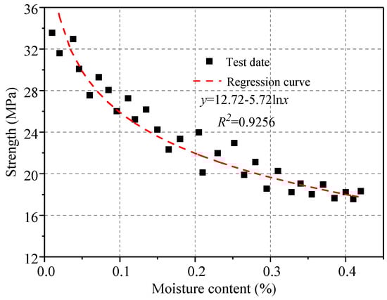 According to Table 2, the mineral compositions of the mudstones were essentially the same. The clay minerals were mainly illite, followed by kaolinite, chlorite and montmorillonite, which are easily capable of causing mudstone expansion. The laboratory test results showed that the expansion rate of the four cores were 8.96%, 6.59%, 4.27% and 4.56%, respectively, which are not conducive to the stability of the surrounding rock. Figure 5 shows that the strength of mudstone steadily decreased with the increase in the moisture content. When the moisture content was less than 0.05, the strength was close to the dry strength. The strength tended to be stable when the moisture content was greater than 0.3, and the mudstone’s average strength dropped by 41.18%. Thus, the stability of the surrounding rock and the safety of the tunnel could be threatened as a result of groundwater cause swelling in the rock and damaging the strength of the mudstone.