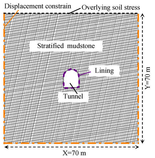 The majority of the surrounding rock was moderately weathered mudstone with developed joints and layered structures, which intensified the stress inhomogeneity of the surrounding rock on both sides. It was easy to cause slippage and significant rock deformation along the joint surface during construction. Additionally, the surrounding rock with a layered structure had the tendency to slide and separate along the joint’s surface under the influence of high geostress, which aggravated the risk of the asymmetric distribution of surrounding rock deformations and lining cracking [19,22,39]. The deformation distribution and development features of the stratified surrounding rock were calculated and analyzed using the discontinuous deformation analysis (DDA) algorithm. There were primarily two sets of joints in the tunnel site region, as evidenced by the rock composition determined through geological inquiry and construction (see Table 3 for joint parameters). Table 4 displays the mechanical parameters of the block and interface in the model. The model dimensions were X × Y = 70 m × 70 m, to consider the full extent of tunnel excavation disturbance. The initial stress applied to the upper boundary of the model was chosen from the weight of the overlying soil. The upper boundary was treated as a free boundary during calculation, while the horizontal displacement of left and right boundary and the vertical and horizontal displacement of the bottom boundary were constrained. The model is depicted in Figure 6.