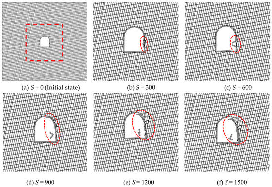 Figure 7 shows that the rock block sliding and extrusion along the joint plane and the block caving of the lining structure were the primary manifestations of the instability of the tunnel structure. With the increase in calculation steps (S), the deformation of the surrounding rock and lining increased gradually. The surrounding rock block had not moved in the initial state, and the rock and tunnel were in a stable state, as shown in Figure 7a. The block system has no displacement, and the overall deformation of the surrounding rock and lining was small when S = 300. As shown in Figure 7c, the side walls of the tunnel, which were affected by the layer joint structure, clearly displayed an asymmetric distortion on both sides. The block on the right side wall first loosened when S = 600. The rock and lining block surrounding the right spandrel began to loosen as the calculation step (S) increased due to the slipping and spalling of the block at the side wall position (see Figure 7d). The deep rock blocks started sliding along the joint plane as construction progressed, and the rock deformation around the tunnel rose quickly. The rock mass on both sides clearly exhibited asymmetric deformation, and the lining blocks around the spandrel spall under the extrusion action of the rock blocks (see Figure 7e). When S = 1500, the surrounding rock deformation tended to stabilize. The overall displacement of the rock mass was largest on right side, which induced an instability in a wide range of the rock block and a spalling of the lining block. On the contrary, the overall deformation on the left side of the tunnel was small, and there was no obvious slip or collapse between the surrounding rock and lining structure block. Finally, the maximum horizontal displacement of the right side wall reached 235 mm, which was 40 mm larger than the left side wall. This leads the lining displaying asymmetric deformation and cracking on both sides, which fits with the actual disaster situation in the field.