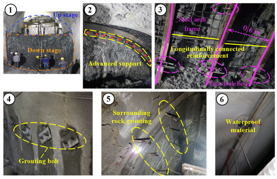 The following specific control measures were suggested in conjunction with an analysis of the disaster-causing mechanisms in the engineering literature: (1) According to the existing engineering experience [40,41,42], the full-section excavation should be converted into a bench excavation with a bench length, L, of 4 m. (2) To increase the integrity of the surrounding rock, advanced support techniques such as grouting pipe sheds should be used. (3) To increase the overall stiffness and stability of support structure, the space between the steel arches should be reduced from 1 m to 0.6 m, and locking bolts and longitudinal reinforcement bars should be added. (4) The grouting bolt should be positioned vertically to the layered joint surface to enhance the integrity of the surrounding rock. (5) To improve the bonding between the joint surface and the integrity of the rock mass, the surrounding rock should be grouted with a grouting pressure of 2 MPa. (6) Waterproof material should be laid before pouring the lining structure to prevent pore water from seeping into the secondary lining concrete. Meanwhile, the lining concrete should be poured following the design exactly, and subsequent maintenance should be performed correctly. The surrounding rock reinforcement and supporting structure construction on-site are shown in Figure 8.