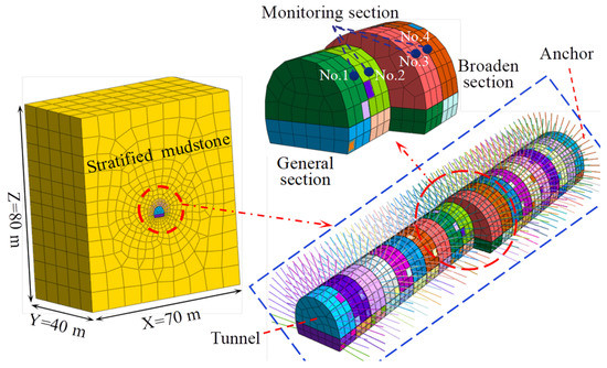 Targeted control measures were suggested in this study together with the disaster characteristics and the disaster-causing mechanism analysis discussed above. To verify the effectiveness of the proposed measures, the deformation and stress of the surrounding rock and secondary lining under the reinforcing scheme were simulated and analyzed through the Midas GTS/NX software, a specialized finite element program in geotechnical engineering [43]. Fully considering the influence range of the tunnel excavation to guarantee the accuracy and effectiveness of the calculation results, the specific model dimensions were X = 70 m, Y = 40 m and Z = 80 m, which were divided into 80543 units and 53286 nodes. Mixed hexahedron mesh elements were used for the simulation of the surrounding rock, while elastic plate elements were used to model the initial support and secondary lining, as shown in Figure 9. The upper boundary was treated as a free boundary during calculations, while the horizontal displacement of the left and right boundary and the vertical and horizontal displacement of the bottom boundary were constrained. During the calculation process, a deformation criterion (1 × 10−6 m) was used to ensure the finite element calculation results were converged. After the calculation, the deformation and stress evolution laws of the surrounding rock and supporting structure were analyzed. In addition, the finite element software used in this study had GPU acceleration options, the computer processor was i7-8700 3.20 GHz and the graphics card model was NVIDIA GeForce GTX 1050 Ti, which could meet the calculation requirements of the numerical model. The soil parameters were obtained through laboratory testing and data from geological surveys (see Table 1), and the parameters of the reinforcement material are displayed in Table 5.