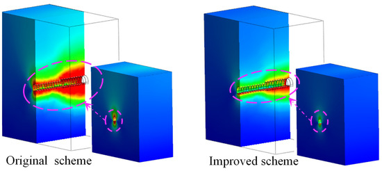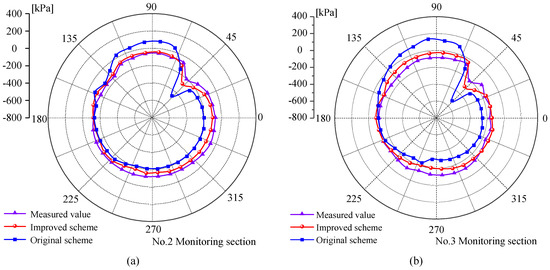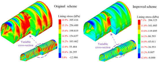 Excavation unloading caused stress redistribution in the surrounding rock; Figure 13 shows that the stress distribution of the secondary lining was similar under the two construction schemes, while the stress obviously decreased after adopting the improved scheme. The vault was mostly subjected to tensile stress as a result of pressure from the surrounding rock, whereas the arch shoulder and arch waist were mainly subjected to compressive stress. Meanwhile, due to the geological eccentric compression and the excavation disturbance generated by different construction steps, there was an asymmetric distribution in the lining stress along the tunnel. In addition, the concentration of stress occurred at the variable cross-section, whereas the lining stress changed obviously, increasing the possibility of lining deformation and cracking. After excavation was completed, the maximum stress of the lining under the improved construction scheme was reduced by 33.16% compared with the original scheme, ensuring the safety of the secondary lining.