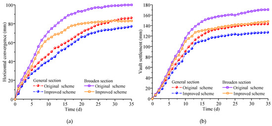By comparing Figure 10 and Figure 11, it was discovered that the development of the plastic zone and deformation under the two schemes were similar, and the deformation value dropped under the improved construction scheme. Figure 10 shows that the deformation response region significantly decreased, particularly in the broadened section, and the plastic zone at the vault was tightly controlled. According to Figure 11, the improved building strategy resulted in a large reduction in the cumulative deformation, whereas the surrounding rock deformation increased sharply in the early stages. The deformation rate and cumulative value of the two kinds of deformation rose during the excavation of the broadened section as the tunnel was excavated from the general section in the direction of the broadened section. It was shown from Figure 11a that the cumulative convergence of the two kinds of section in the first 10 days under the improved construction scheme were 40.27 mm and 63.82 mm, respectively. These values decreased by 14.81% and 10.53%, respectively, compared to those of the original scheme. Similarly, the cumulative vault settlement in the first 10 days was 85.66 mm and 109.54 mm, respectively, this value dropped by 5.52% and 5.49%, respectively, compared to those of the original scheme (see Figure 11b). After the excavation, the rock deformation first tended to remain stable under the improved scheme due to the improvement in the surrounding rock integrity and support structure strength. Finally, the cumulative convergence deformation of the two kinds of section under the improved scheme were 77.11 mm and 82.99 mm, respectively, and the values of cumulative settlement were 126.98 mm and 147.89 mm, respectively. The two deformations in the broadened section were greater than those in the general section. Additionally, compared to the original construction scheme, the convergence deformation of the two sections was reduced by 10.53% and 16.95% under the improved construction measures. Additionally, the values of vault settlement were 11.28% and 13.29%, respectively. Two kinds of deformations both demonstrated that the construction improvement strategies suggested in this study could efficiently reduce the significant deformation of the surrounding rock in tunnels in layered soft rock stratum.