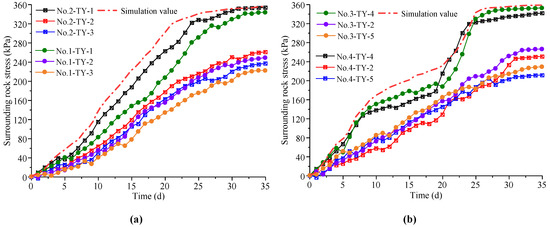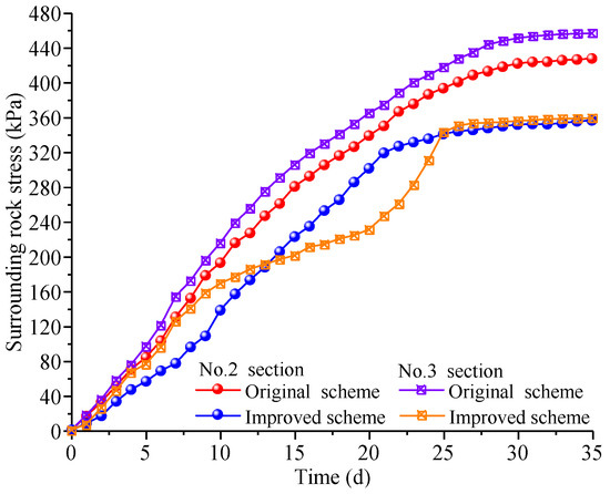 The data was presented in terms of the evolution of the surrounding rock stress with time, as shown in Figure 16.