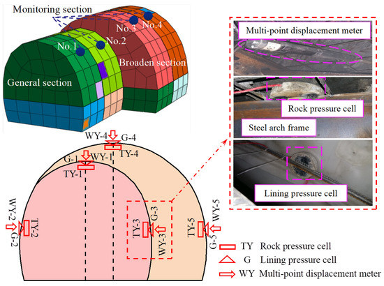 Four monitoring positions were selected at 2 m and 6 m away the variable cross-section in both sections, where an earth pressure cell and multi-point displacement meter were embedded to monitor the stress and deformation of the surrounding rock. The layout of the monitoring stations, monitoring points and the installation of the components on-site are shown in Figure 14. During the tunnel construction, the stress and deformation of the surrounding rock and support structure were strictly monitored to ensure the construction safety.