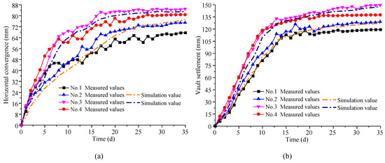 Figure 11. The simulation results of surrounding rock deformation: (a) horizontal convergence and (b) vault settlement.