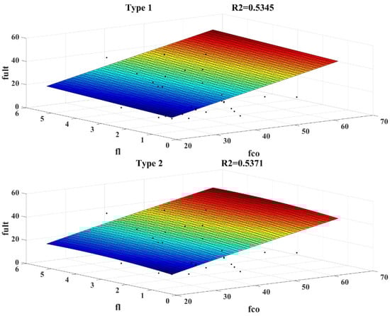 Equation (16e) has the highest coefficient of determination (R2 = 0.8280) and the lowest RMSE value (RMSE = 0.5382), the results are shown in Table 8. Therefore, in terms of the parameters and , Equation (16e) is the best for predicting the axial strain corresponding to the peak strength of concrete confined with SMA spirals.