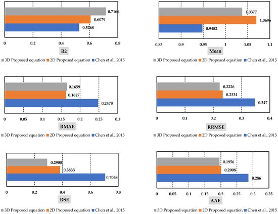 In these equations, Xthe and Xexp are the theoretical and experimental values, respectively, and n shows the number of specimens. and are the mean values of the theoretical and experimental estimations, respectively. The R2 (coefficient of determination) varies from 0 to 1, and a higher value indicates a better fit of a model. On the other hand, a lower RMSE (root mean square error) value indicates higher accuracy of the proposed model [67].