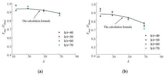 The maximum horizontal load V0max of the beam-column member is obtained by pure bending FEA. As shown in Figure 16, V0max/V0P shows a nonlinear decreasing relationship with the increase of h/t.