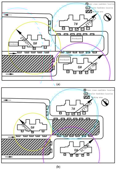 (a) Tower crane arrangement before optimization; (b) optimized tower crane arrangement diagram.