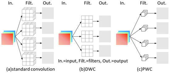 All standard convolutions other than the backbone are replaced by DSC [33], including standard convolutions in the decoder to accelerate the detection. DSC can be divided into depthwise convolution (DWC) and pointwise convolution (PWC) [34]. The comparison of these convolution operations is shown in Figure 2. Take the convolution operation in Figure 2 as an example. There are four filters in the standard convolution, and each filter has three convolution kernels, which correspond to three channels of the image. After convolution, the feature maps with the same number of filters is obtained, and the parameter quantity is 4 × 3 × 3 × 3 = 108. There is only one convolution kernel in each filter of DWC, which is responsible for one channel, respectively. The number of channels before and after convolution remains unchanged, and the parameter quantity is 3 × 3 × 3 = 27. The convolution kernel size of PWC is 1 × 1, and its function is to generate a new feature map by weighted combination of the output feature maps of the upper layer. It is a special case of standard convolution when convolution kernel size is 1 × 1 and the parameter quantity is 1 × 1 × 3 × 4 = 12. After DWC and PWC, a four-channel output can also be obtained, which is the same as in standard convolution. Moreover, compared with the standard convolution, the parameter quantity of DSC is 27 + 12 = 39, which is only 36.1% of the standard convolution, and the calculation cost is significantly reduced.