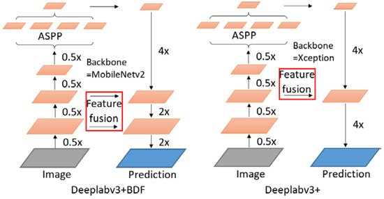 According to some defects in the current research described in Section 1, including defects relating to detection efficiency, boundary ambiguity and initial weight mismatch, we propose a method to improve the model accordingly and rename the model according to the optimization strategy used, namely Deeplabv3+ BDF.