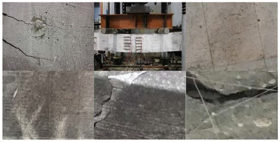The biggest difference between the actual project and the laboratory scene is the environment around the crack. Generally, images obtained in the field experience interference due to handwriting, template lines and other crack-like objects, while the crack images obtained in the laboratory have a monotonous background and no sundries; so, the trained model is difficult to extend to practical applications. Therefore, we take 82 images from multiple scenes. The illumination conditions, exposure intensity and acquisition equipment of these images are different, so the dataset has enough diversity. Because the dataset is collected by mobile phones or high-definition cameras, the image capture distance varies in a large range (0.2 m to 5 m), and the image scene also has enough complexity; the trained model has good recognition effect on common crack images. However, the model has the potential to improve the recognition effect of fine cracks, especially for cracks where the width is less than 1 pixel, which are very easy to be missed in detection. This is also the difficulty of the semantic segmentation model used for crack detection at present. Examples of the dataset are shown in Figure 4. Four images at 3840 × 2880 pixels are from a composite plate failure experiment, eight images at 1920 × 1080 pixels are from another composite plate experiment, four images at 4608 × 3456 pixels are from a bridge, seven images at 4608 × 3456 pixels are from some cracked walls or structures in Zhejiang University, five images at 1920 × 1080 pixels are from a concrete beam bending experiment and five images at 1920 × 1080 pixels are from a concrete column bending experiment. These images are manually labeled at pixel level using the Labelme program. Another 49 images at 1920 × 1080 pixels are obtained from a concrete beam bending test, and CAs are made to enable the model to be pretrained. Although transfer learning is an effective strategy, its initial weights are usually trained by multi-class objects, and there are a lot of irrelevant or weak correlation features. After transfer learning, more pretraining for cracks can weaken these irrelevant or weak correlation features and strengthen the recognition and extraction of crack features.