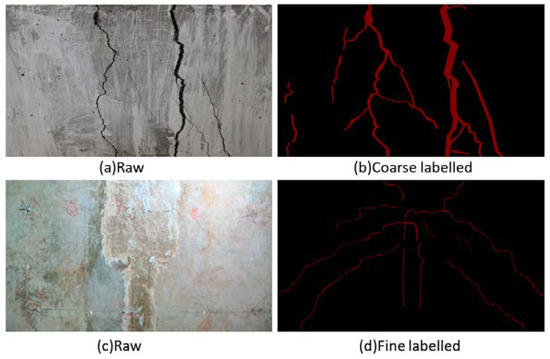 The comparison of CA and FA is shown in Figure 5. CAs use more long lines and obvious angles to represent the irregular contour of the crack. The form shown in the figure shows that the mosaic area is wider, the jagged boundary of the crack is ignored and the final label can be approximately regarded as a polygon, which greatly reduces the time for CA. FAs make the marking points fit the crack as much as possible so that the width of the mosaic and the outline of the label basically match the crack. Therefore, obvious bending does not appear in the figure, and the overall appearance of FA is smoother. It takes about 6 min for an image to be coarsely labeled and 15 min to be finely labeled. This method of training based on two types of labels does not require fine labeling of all images and can reduce labeling costs.