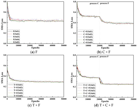 Process T + F and process F, which are two conventionally used training strategies with convergence values of about 0.30 and 0.42, respectively, without process C can also converge but are higher than T + C + F. In the two strategies without process T, the SMA curve fluctuates in different degrees. Note that this is the average curve, and its fluctuation is somewhat mitigated, but it still has disadvantages compared with the corresponding curves of the two strategies with process T. Therefore, process T is necessary.