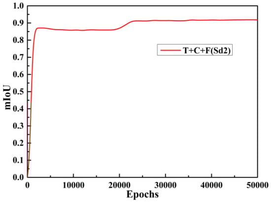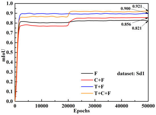 where TP, FP and FN represent true positive, false positive and false negative, respectively, and K is the number of target categories in all images. Figure 7 shows that, when the training strategy is T + C + F and the dataset is Sd2, the change of mIoU curve is opposite to the loss curve, but the change trend is the same, that is, when process F is carried out after the convergence of process C, the curve has a certain mutation. The mIoU curves of the four training types on the Sd1 subset are shown in Figure 8. From the comparison between F and C + F, and the comparison between T + F and T + C + F, it can be seen that, although the curves of C + F and T + C + F are lower at the initial stage, the inversion is achieved after 20,000 iterations, which indicates that the models with CA and FA training have significant optimization in terms of mIoU.