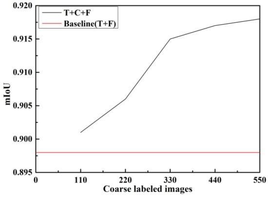 Some experiments are carried out on the proportion of data required by process C and process F, and the final mIoU is taken as the evaluation index. A total of 550 CA images are divided into five sub-datasets. Trial training is conducted according to the number of sub-datasets from 1 to 5, and the mIoU of each experiment is recorded, which can be seen in Figure 9. The results show that the difference of mIoU is within ±0.03 after using three or more sub-datasets, i.e., 330 CA images, which can be regarded as the fully developed optimization potential. However, this result is only for the task of this paper. In an actual project, the number ratio of CA and FA images should be determined according to the complexity of the task, the characteristics of the object and other factors. Section 3 describes the time spent in annotation, and an FA image is 2.5 times a CA image. If 330 or more CA images are labeled according to the FA image standard, it takes more time to achieve the same result, and this problem can be solved using the three-step training strategy proposed in this paper.