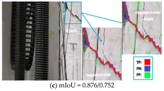 Deeplabv3+ BDF gives more accurate segmentation results of all fractures and obtains significant advantages over the comparison model in mIoU. Figure 10a is a crack image containing a small cavity with simple background. Deeplabv3+ BDF-single incorrectly identifies the cavity as a crack, but Deeplabv3+ BDF does not. The segmentation results show that the mIoU of Deeplabv3+ BDF-single is only 0.831 even in simple background, and more FP pixels appear on the dark concrete background at the crack edge. Figure 10b contains a fuzzy fine crack. Fine cracks are the key and difficult task of crack detection. However, due to the accuracy of human eyes, the edges of cracks cannot be accurately marked, which makes it difficult to completely segment the fine cracks. Deeplabv3+ BDF has less truncation on the whole fine crack and less error expansion at the crack edge, while Deeplabv3+ BDF-single detects a complete fine crack as nearly 10 cracks, and the mIoU also reflects the performance difference from the data level. Figure 10c contains a spalling concrete surface, and the crack that passes through it can be confusing. Deeplabv3+ BDF overcomes the problem of crack area expansion caused by spalling to a certain extent, but there are a lot of FN results in the spalling area, which still has the potential for improvement. Deeplabv3+ BDF-single has a similar problem in dealing with the problem of spalling concrete. The whole crack is segmented more thinly, and the detection of the next thin cracks still fails, and the instrument circuit is classified as crack, which is unacceptable. It can be seen from Figure 10 that most of the FP and FN values of the crack segmentation task appear at crack boundary, which is the reason why we choose to fuse the shallow feature map, because it corresponds to the edges and corners of crack. Although the judgment of crack boundary is subjective due to the different degrees of image blur, at an overall level, however, the additional feature map fusion strategy reduces the proportion of FP and FN and has advantages in filtering various complex backgrounds or processing cracks with different widths.
