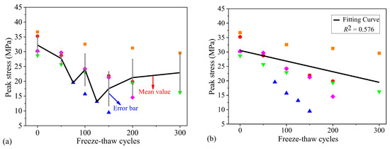 The statistical parameters and experimental data of the peak stress of plain concrete listed in Table 1 are drawn in Figure 1. As seen from Figure 1a, the peak stress exhibited an overall downward trend [6,24,25,26]. When freeze–thaw cycles reached 300, the mean value of the peak stress of C30 concrete decreased by 28.93%. Under different freeze cycles, the peak stress fluctuated greatly. For instance, in the early freeze–thaw cycling stages, the discrepancy was relatively small. However, the closer to the later stages of the freeze–thaw cycling, the greater the discrepancy. The range of the variation coefficient was between 0 and 0.33, indicating the strong discrepancy of the test results. Next, the peak stress parameters were fitted, which is shown in Figure 1b, and the compressive strength of plain concrete can be determined by,