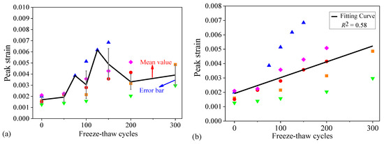 The statistical parameters and experimental data of the peak strain of plain concrete listed in Table 1 are drawn in Figure 2. As seen from Figure 2a, the peak strain of concrete exhibited an overall upward trend [10,27,28]. As freeze–thaw cycles reached 300, the mean value of the peak strain increased by 1.3 times. Under different freeze–thaw cycles, the peak strain fluctuated greatly. For example, in the early stage of freeze–thaw cycling, the discrepancy was relatively small. However, the discrepancy increased significantly in the middle time period. The variation coefficient range was between 0 and 0.41, suggesting the strong discrepancy of the test results. Similarly, the peak strain parameters were fitted, as shown in Figure 2b. The peak strain of plain concrete can be obtained by,