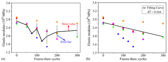 The statistical parameters and experimental data the elastic modulus of plain concrete listed in Table 1 are shown in Figure 3. As seen from Figure 3a, the elastic modulus of concrete also exhibited a global downward trend [26,29,30,31]. When freeze–thaw cycles reached 300, the mean value of the elastic modulus of concrete decreases by 16.54%. Under different freeze–thaw cycles, the discrepancy of the test results fluctuated greatly. In the early stages of freeze–thaw cycling, the discrepancy was relatively small. The closer the process to the later freeze–thaw period, the greater the discrepancy. After the calculation, the variation coefficient range of the elastic modulus was between 0 and 0.18. Next, the elastic modulus parameters are fitted, which is shown in Figure 3b. The elastic modulus of plain concrete can be acquired by,