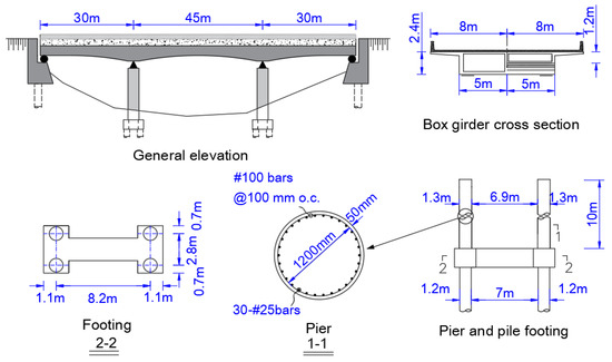 During the service period of RC structures, the mechanical properties of concrete would be deteriorated due to freeze–thaw damage, which may seriously impair their seismic performance [17,26,27]. In order to study the deterioration effects caused by free-thaw damage on C30 concrete, a deterioration model of RC columns was constructed. A typical three-span continuous girder bridge was selected as the example. Figure 4 displays the layout and configuration of the bridge. In this case, C30 concrete was used for RC columns of the bridge.