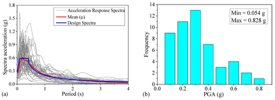Based on the site conditions of the bridge, this paper selected 50 natural seismic records from the PEER Ground Motion Database [50]. Figure 5a displays the response spectra of the selected seismic records. As seen from Figure 5a, the mean value of acceleration spectra of the seismic records was consistent well with the target design response spectra according to [51]. Moreover, selection of the appropriate seismic IM is also critical. Based on several previous studies [52,53], the peak ground acceleration (PGA) is demonstrated to be a sufficient and practical IM. Thus, this study employed PGA as the seismic IM. Figure 5b shows the PGA distributions. As shown in Figure 5b, the selected seismic records covered a wide range of PGA. The moment magnitudes of the records were between 5.7 and 7.2 and their source distances were between 15 and 100 km, respectively.