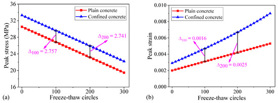 The variations in the constitutive parameters of RC columns under different freeze–thaw cycles: (a) the peak stress and (b) the peak strain.