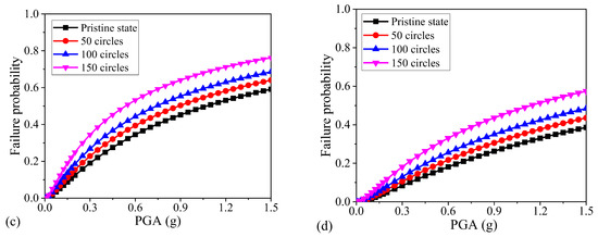 Figure 7 shows the generated fragility curves of the columns. As seen from Figure 7, the damage probability of the columns exceeded their ductility limit with the increase of freeze–thaw cycles, indicating the significance in considering the freeze–thaw damage on the deterioration of the concrete constitutive properties. In the first 100 freeze–thaw cycles, the growth of failure probability of the columns was relatively slow. Nevertheless, after 100 cycles, the growth of failure probability was relatively significant. For example, as shown in Figure 7c, for the pristine columns, the probability of extensive damage to the columns without freeze–thaw damage under a PGA of 0.6 g was 32.6%. However, after 150 freeze–thaw cycles, the probability of extensive damage exceeded 50%. Likewise, as shown in Figure 7d, compared to the as-built columns, the failure probability increased by 25.4% and 48.7% after 100 and 150 freeze–thaw cycles under a PGA of 1.5 g, respectively.