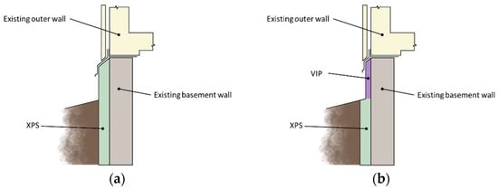 This paper addresses a solution to the specific challenge of upgrading a basement wall without compromising the aesthetic aspect of the building (a “good” solution), by using superinsulation. In this case, the superinsulation is vacuum insulation panels (VIP), which is a high-performance thermal insulation [,]. The purpose is to avoid suboptimal upgrades from an energy and carbon perspective, which may lead to building elements being “lost” for upgrades until the next time the building element is due to be maintained or replaced. For a basement, the window of opportunity for upgrading will be closed for 20–60 years after an upgrade (depending on the service life of the building element).