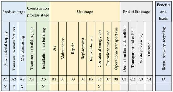 Carbon footprint calculations are based on the life cycle assessment (LCA) methodology, consisting of four stages: (i) goal and scope definition, (ii) life cycle inventory, (iii) life cycle impact assessment and (iv) interpretation. The carbon footprint calculations for the basement are based on the Norwegian standard NS3720 Method for greenhouse gas calculations for buildings [], with life cycle modules A1–A3, A5 and B6 (as shown in Figure 2). Carbon footprint calculations for the materials are based on the European standard EN15804 Sustainability of construction works—Environmental product declarations—Core rules for the product category of construction products [].
