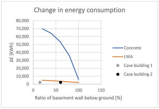 The energy consumption has been calculated based on the U-values calculated in the parametric model for the basement for different ratios of basement wall below ground and for three upgrading scenarios (with the existing construction and upgrades with VIP/XPS and only XPS). The results are presented in Table 5 (ΔU is the difference in U-value before and after the upgrade and ΔE is the difference in energy demand). The results show that the concrete construction has the highest energy consumption before the upgrade and also the highest reduction, 88.3% for the most exposed basement. Depending on how much of the wall is exposed, the energy reduction is from 43.2% to 88.3% for the concrete wall and from 20.4 to 36.5% for the light-weight aggregate (LWA) wall.