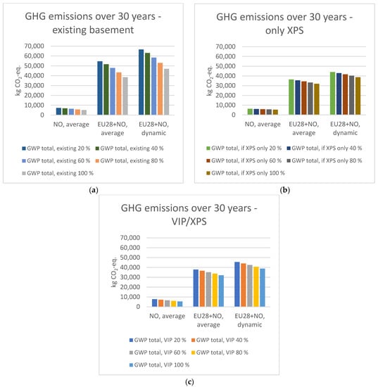 Accumulated GHG emissions over 30 years for three different electricity scenarios: (a) the existing basement; (b) an upgrade with only XPS; (c) an upgrade with superinsulation (VIP above ground and XPS below ground). Percentages indicate how much of the wall is below the ground.