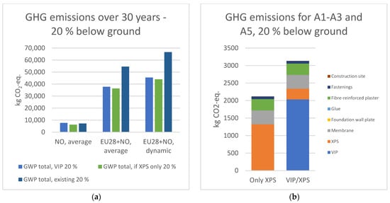 Figure 6a,b show the results for a scenario with 20% of the wall below the ground, accumulated over 30 years. The reason for selecting 20%, is that this will be the scenario with the highest carbon footprint, as it has the highest amount of VIP. The first figure shows the accumulated carbon footprint for the three different alternatives (no upgrade, only XPS and VIP/XPS) with three different electricity scenarios. The results show that in all cases the VIP/XPS upgrade has a slightly higher carbon footprint than the upgrade with only XPS. Only with the Norwegian electricity scenario does no upgrade perform better than upgrades, here the VIP/XPS has a ca. 7% higher carbon footprint than no upgrade. This shows that when the energy grid has a very low emission intensity, the payback period of the carbon footprint for materials becomes longer. With the other two electricity scenarios, the upgrade alternatives outperform the no upgrade alternative. The difference between VIP/XPS and only XPS is ca. 3–4%, showing that the carbon footprint of materials is much less significant when the energy grid has a high carbon emission intensity. Figure 6b shows the carbon footprint for the materials (life cycle modules A1-A3) and construction (life cycle module A5). Here, the carbon footprint is 48% higher for the superinsulation alternative.