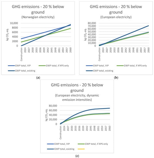 The previous figures show the accumulated carbon footprint over a period of 30 years. To understand how different methodological choices influence the results, it is useful to plot the results over time, as shown in Figure 7a–c. These figures show the carbon footprint payback time for the two alternative upgrades, for a scenario where 20% of the wall is below the ground. Figure 7 shows the results with Norwegian electricity mix. This choice of electricity mix has the longest payback period, with 18 years for the upgrade with only XPS and 35 years for the upgrade with VIP and XPS. Figure 7b shows the results with the European electricity mix, with a payback period of 2 and 4 years, respectively. Figure 7c shows the results with the European dynamic electricity mix. Here, the payback period is 1 year for both upgrade alternatives (ca. 6 months for only XPS and ca. 12 months for VIP and XPS). Choice of electricity mix significantly influences the results of the carbon footprint analysis.