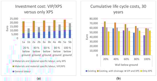 (a) The cost of upgrading with VIP and XPS versus upgrading with only XPS. Values in Eruo. Basement wall height is 240 cm, where 30 cm are always above ground. Percentages refer to how much of the remaining 210 cm are below the ground; (b) the cumulative life cycle cost for four alternatives (no upgrade, only drainage, upgrade with VIP and XPS, and upgrade with only XPS). Values in Euro.