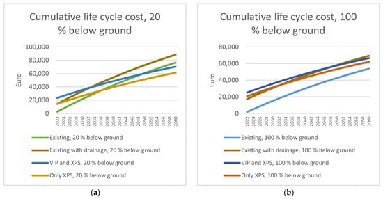 (a) The cumulative life cycle cost for four alternatives with 20% of the basement below ground (no upgrade, only drainage, upgrade with VIP and XPS, and upgrade with only XPS). Values in Euro; (b) The cumulative life cycle cost for four alternatives with 100% of the wall below the ground (no upgrade, only drainage, upgrade with VIP and XPS, and upgrade with only XPS). Values in Euro.