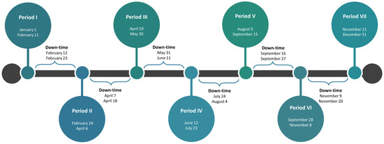 To maximize profit, it is recommended that broilers’ production duration is 41 and 42 days. The number of annual cycles affects profitability on the one hand and the length of the production period on the other. Further, the length of downtime (the time the barn is empty for manure removal, disinfection, and rest) between production periods affects the number of annual cycles. This study assumed an annual rotation of 7 cycles with a 42-day production period and a 12-day downtime period (Figure 1).
