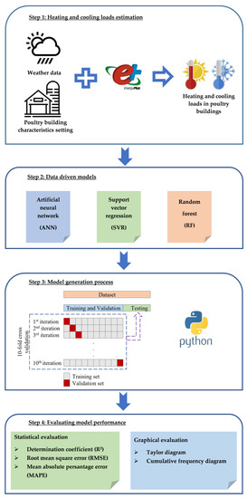 The data-driven-based method used to predict poultry buildings’ heating and cooling loads is a four-step process, as shown in Figure 2.